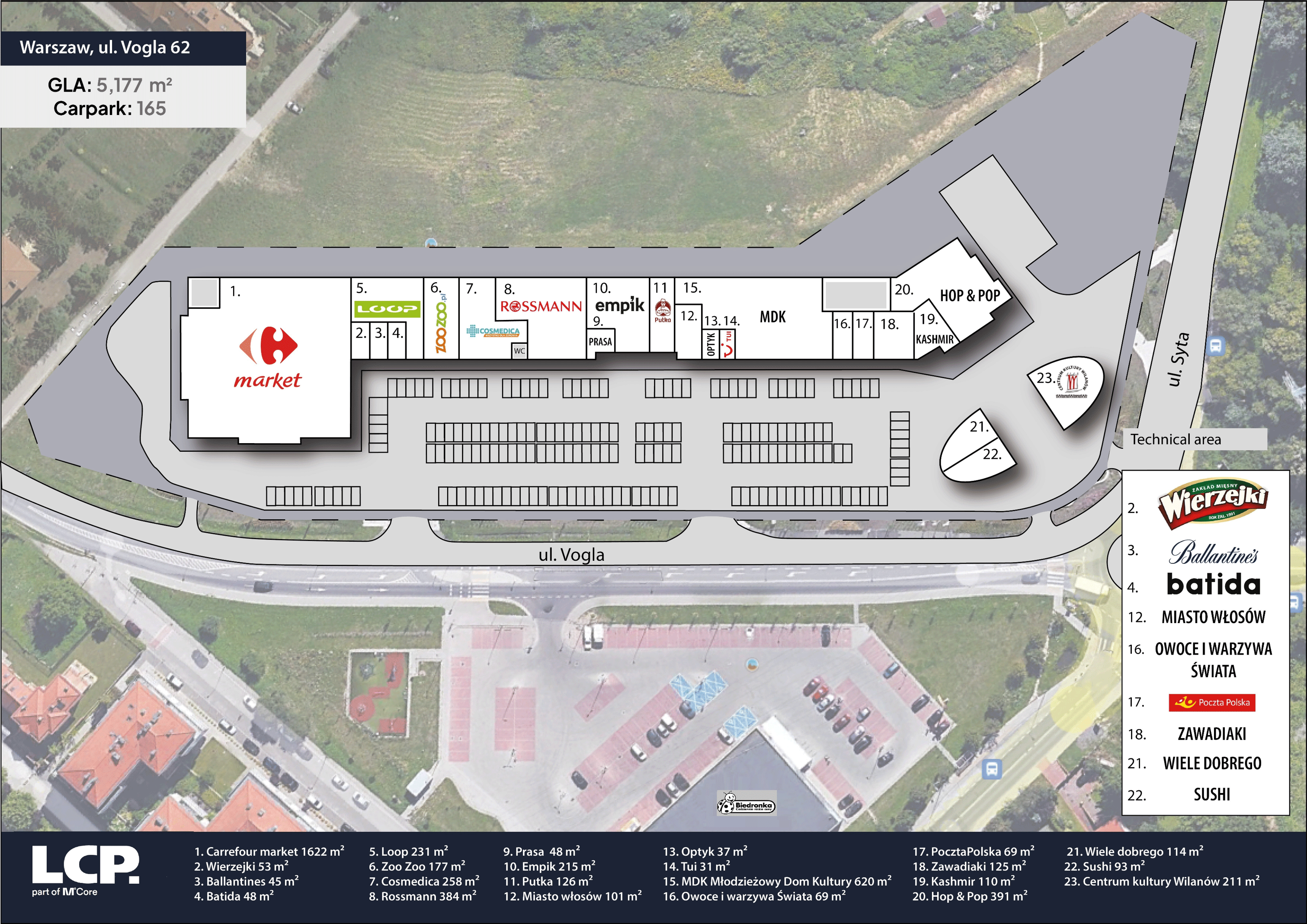 A commercial facility with an offer for a more affluent wallet. Unique shops, but also chain stores, an offer adequate for the local residents of Wilanowskie Zawady. Proximity to the S2 route. The facility on the outskirts of Wilanów, with access from ul. Syta and Vogla to the main streets of Warsaw.
